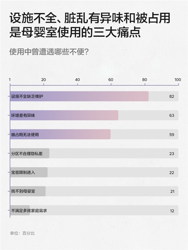 2023年,上海外国语大学“爱佑未来”母婴室调研组调研显示,高达94.8%的受访者偏向非常有必要改善现有母婴室。2025年,医师报联合Babycare、浙江省妇女儿童基金会发布了针对4219位妈妈的母婴室调研,结果显示,“设施不全”、“有异味”和“被占用”在母婴室问题中排名前三。有超六成妈妈希望母婴室环境更干净、设备更齐全、服务更完善。
