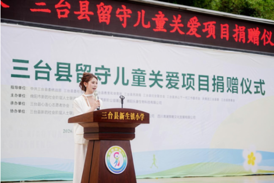 仪式上,绵阳乐康生物科技有限公司通过科技城君茗荟新阶公益基金,向三台县心连心志愿者协会捐赠15万元,专项用于2026年暑期留守儿童关爱活动;向三台县新生镇小学捐赠5万元,用于校园安全防护网安装、运动服采购及儿童帮扶。此外,企业还捐赠了300册图书和70套生活物资。